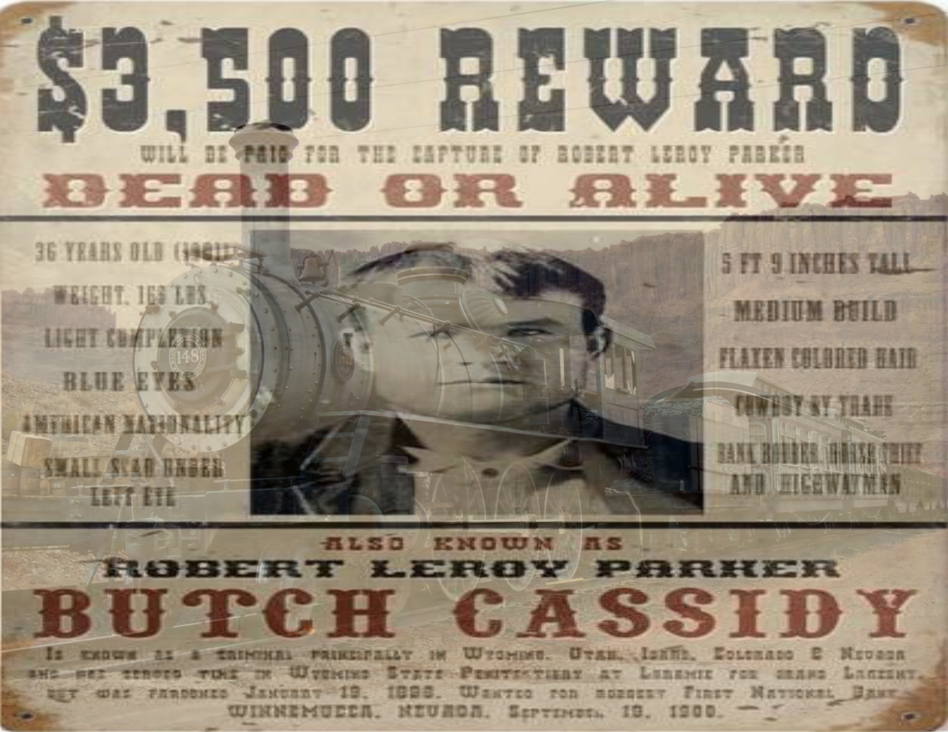 Design: This tumbler features a vintage "Wanted" poster design with a detailed image of Butch Cassidy along with a background showing the trains he infamously robbed. The poster includes classic elements such as reward details, aged paper effects, and western-style fonts.